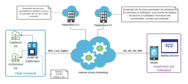un ou plusieurs objets munis de capteurs, d'actionneurs et d'une unité de traitement possédant des interfaces lui donnant accès à l'Internet (Wifi, Lora, Sigfox) ;
