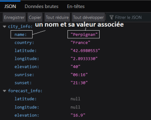La réponse du serveur s'affiche, il s'agit de données au format JSON qui structurent l'information par des couples (nom, valeur).