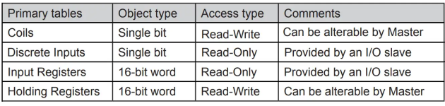 Les registres de type Coils et Holding Registers sont des registres accessibles en lecture et en écriture comme l'indique le tableau suivant :