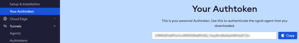 Sur la page Ngrok copier coller la clé YourAuthoken en cliquant sur le bouton Copy :