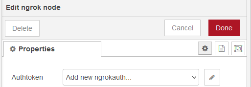 Dans Node-RED double-cliquer sur le nœud ngrok puis cliquer sur Add new ngrokauth..., coller la clé dans le champ authtoken :