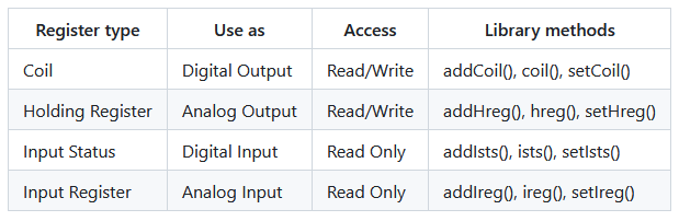 Lien entre les registres et les fonctions de la bibilothèque modbus-serial