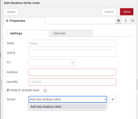 Double-cliquer sur le nœud puis ajouter un nouveau client Modbus (client = maître).