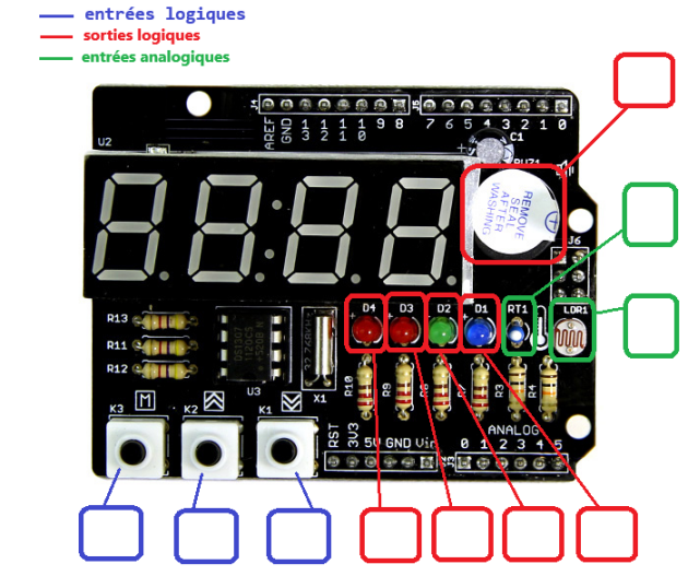 Sur le document remis par le professeur placez les numéros des broches Arduino associées à chaque composant.