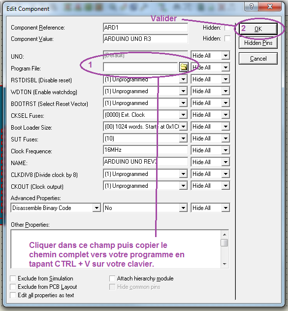 Double-cliquez sur le composant Arduino Uno R3, une fenêtre apparaît :