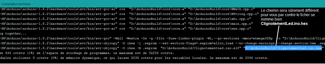 Si le chemin n'apparaît pas après la compilation, cocher compilation et téléversement dans Fichier → Préférences.