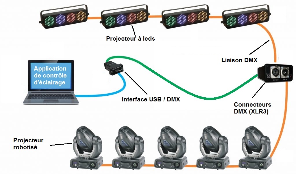 Exemple d'installation d'éclairage contrôlée informatiquement grâce à une liaison numérique DMX