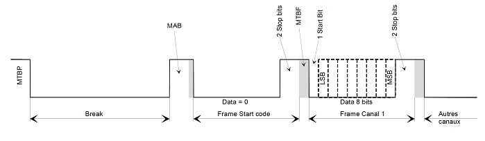 Un paquet DMX correspond à l'envoi de plusieurs trames ou canaux. Chaque trame contient une donnée codée sur un octet.